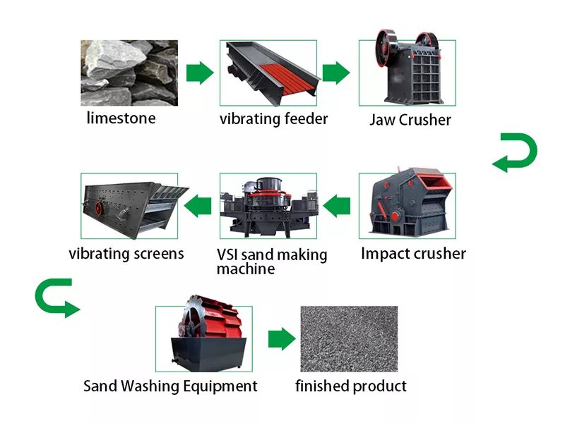 - The Limestone sand making process is divided into four stages: coarse crushing, medium fine crushing, sand making and screening.